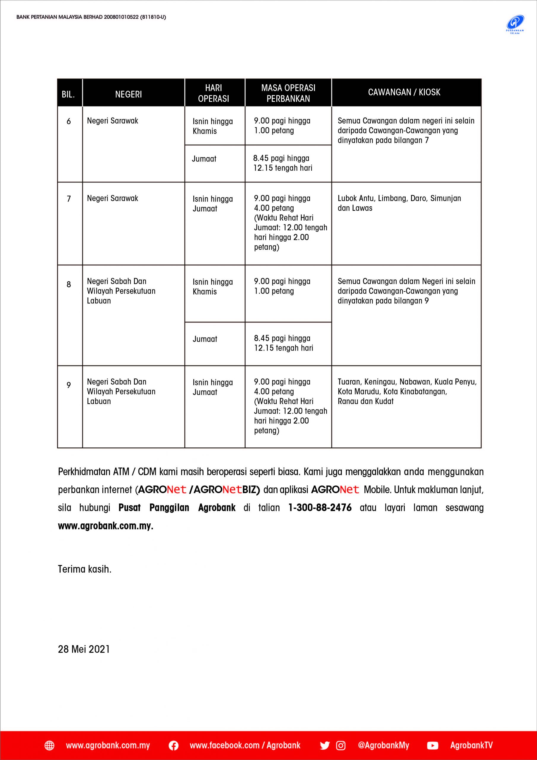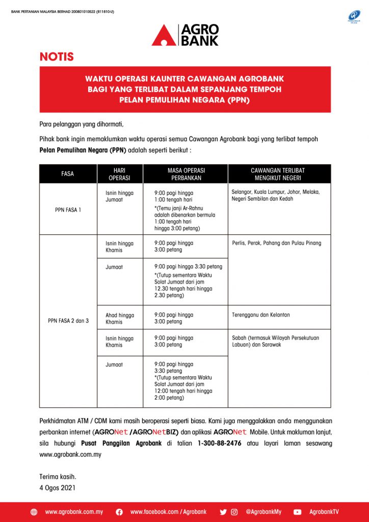 Notis Waktu Operasi Kaunter Cawangan Agrobank Bagi Yang Terlibat Dalam Sepanjang Tempoh Pelan Pemulihan Negara Ppn Agrobank