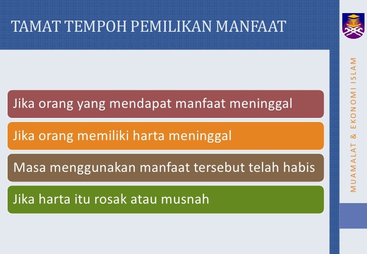Pemilik manfaat adalah orang perseorangan yang dapat menunjuk atau memberhentikan direksi dewan komisaris pengurus pembina atau pengawas pada korporasi memiliki kemampuan untuk mengendalikan korporasi berhak atas danatau menerima manfaat dari korporasi baik langsung maupun tidak langsung merupakan pemilik sebenarnya dari dana atau saham korporasi danatau memenuhi. Walaubagaimanapun jika penyerahan itu menimbulkan kemudaratan kepada pemilik manfaat contohnya tempoh sewaan tanah ladang telah tamat tetapi hasilnya belum dapat dituai maka manfaat tanah tersebut kekal di tangan pemilik manfaat dan beliau dikehendaki membayar sewaan tanah sehingga hasil tanamannya dituai. TAMAT TEMPOH PEMILIKAN MANFAAT Jika orang yang mendapat manfaat meninggal Jika orang memiliki harta meninggal Masa menggunakan manfaat tersebut telah habis Jika harta itu rosak atau musnah HAK IRTIFA AL -AIN Hak memanfaatkan sesuatu benda Hak yang berhubung dengan penggunaan kemudahan- kemudahan seperti hak penyiraman tanaman tali air pengaliran.