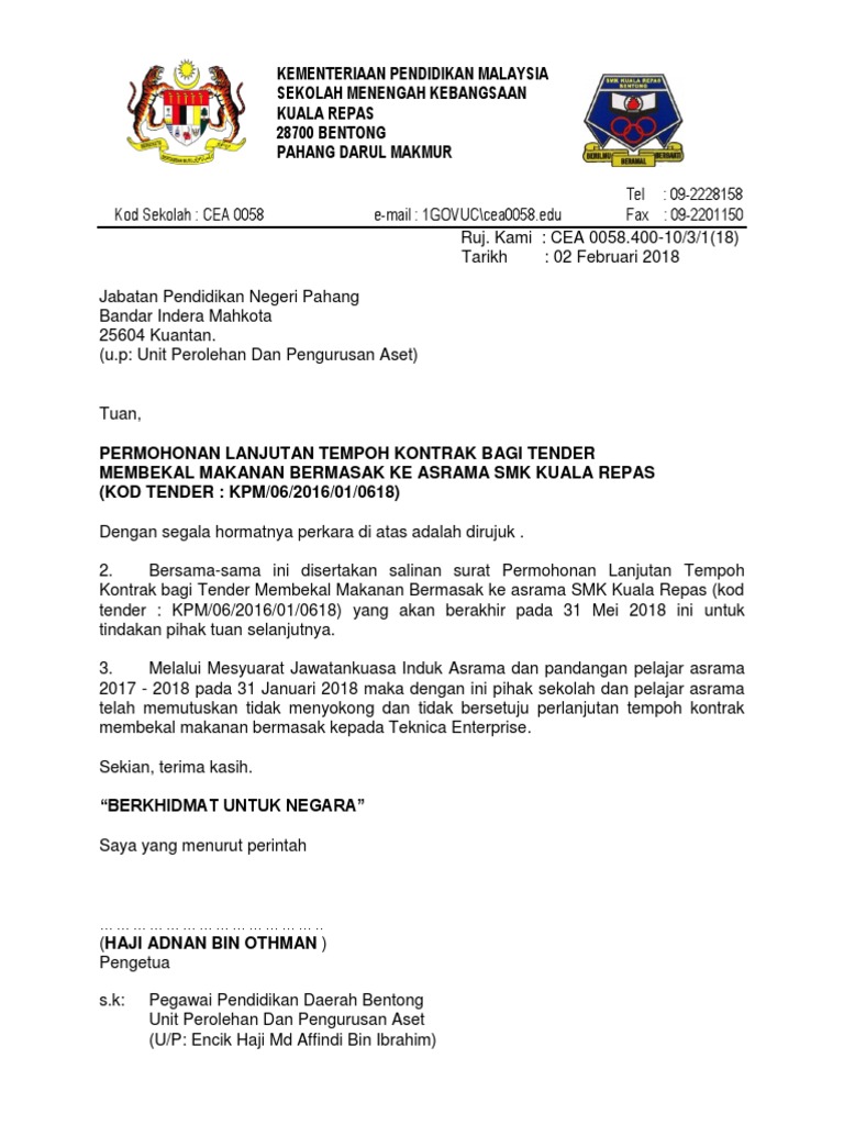 Contoh surat lanjutan tempoh kontrak201 1 d perubahan kontrak dan pelanjutan tempoh kontrak untuk kontrak bekalan dan perkhidmatan dibenarkan bagi perolehan yang diuruskan secara sebut. Surat Permohonan Perlanjutan Tempoh Kontrak hendaklah dikemukakan kepada Jawatankuasa Sebutharga semasa kontrak masih berkuatkuasa. Beliau berkata mengikut fasal 221 Perjanjian Untuk Membekalkan Sistem Bersepadu VLN syarikat boleh memohon pelanjutan tempoh kontrak tidak kurang daripada enam bulan sebelum tarikh kontrak.